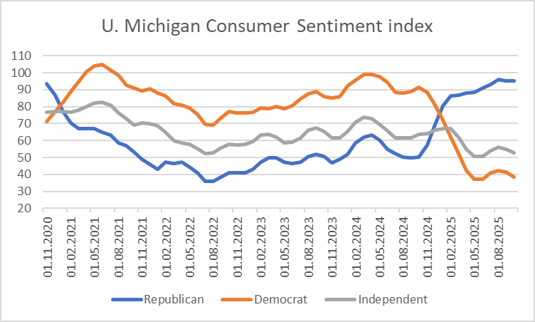 Man ser i tillegg et tydelig politisk mønster. De siste månedene har sentiment data fra USA vist en markant divergens mellom demokrater og republikanere. Etter valget i november 2024 snudde stemningen dramatisk, og for mange markedsaktører farger politiske holdninger risikovurderingen like mye som økonomiske data. Ettersom de politiske kontroversene er større enn noen gang siden andre verdenskrig, er også virkningen på dataene større enn noen gang.